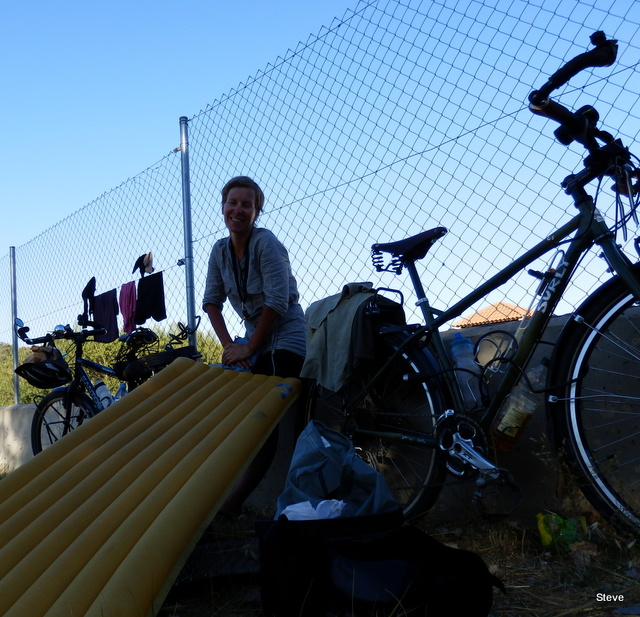 In de avond heb ik voor het eerst sinds lange tijd mijn fleece vest weer nodig. De zon als een harde oranje kogel door de dennenbossen priemend. Het is tien uur wanneer we de camping vinden die gesloten is en door een stel Spaanse familiefietsers worden gewezen op het Roma kamp. Hongerig en moe, een recordafstand gefietst van 107 kilometer. In het donker zetten we ons kleine, compacte kamp op, nogal uit te de toon met de campers die allemaal hun eigen toilet en doucheruimte hebben. Ik ben zo moe dat ik het liefste meteen ga slapen maar weet dat deze beslissing zich zal wreken in de ochtend. Echter, het ontbreekt me aan energie om nog een complete ananascurry in elkaar te toveren en hoewel Steve genoeg zegt te hebben aan wat oud brood vind ik dat wat magertjes na een dag van 110 kilometer. We gaan naar het kamp-restaurant, en eten als schipbreukelingen: salade, roerei met kaas, gebakken pepers met zout, friet en heel veel mayonaise.  Als laatste handling ga ik naar het restauranttoilet, knijp mijn 16-jarige acne uit, met een naald ergens uit mijn portemonnee. Altijd bevorderlijk voor de hygiëne…