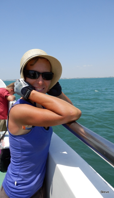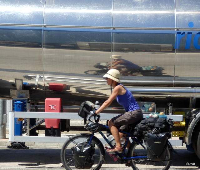 We fietsen richting Rota. Dit gaat nog netjes over fietspaden totdat we op een militair terrein raken. Ik probeer nietsvermoedend door de slagbomen te manoeuvreren  maar wordt prompt aangehouden. ‘Are you military?’ vraagt de militair. ‘Nee,’ antwoord ik. En dus zijn we genoodzaakt de ferry naar Cadiz te nemen en dat is niet voor niets, deze ferry. Het zou een enorme omweg geweest zijn. Nu 13 kilometer over een omstuimige baai ‘Bahía de Cádiz’ waar een cruiseschip in al zijn megaheid me helder in laat zien hoeveel vrijheid fietsen geeft. Vanuit Cadiz, waar we eerst op zoek gaan naar een supermarkt, dan een smakelijke lunch eten uitkijkend over het strand, rijden we over de snelweg verder naar San Fernando. We doorkruisen het stadje, en rijden verder over de snelweg. De strook is nog maar smal, de wind hard en de vangrail dubbel ‘deathrail’ genaamd door Steve. Want als je er tegen aan wordt gedrukt ben je dood. Telkens wanneer een truck me inhaalt maak ik een smak  richting die vangrail dan belanden we in Chiclana de la Frontera, prachtige naam. Je zou niet verwachten dat…