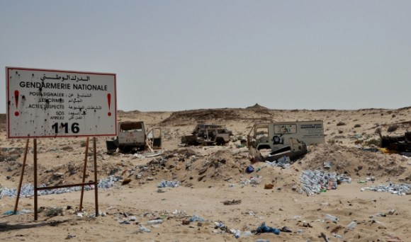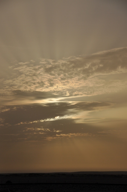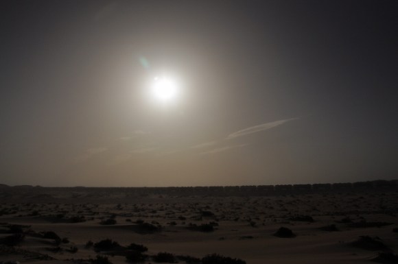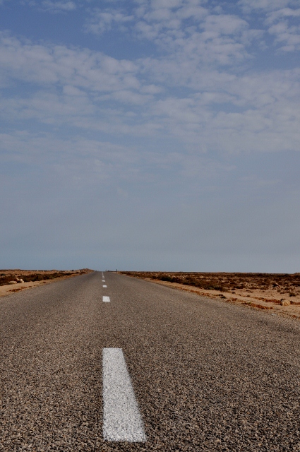 De route naar de grens is wederom mooi. Ik geniet diep van de woestijn, zijn hammada, de kleine heuvels die me aan duizenden mierenhoopjes doen denken en de enorme zandduinen. Typisch is dat op de gehele route stenen op elkaar worden gestapeld zoals je ook in de bergen ziet. Er is bijna geen verkeer en de auto’s die ons inhalen zijn bijna allemaal Mauritaniër met Europese nummerplaten. De wind duwt me vooruit tot aan de grens, twee honden komen wild grommend op me af en proberen me bang te maken, ik ben in staat ze hetzelfde te bezorgen. Een stukje niemandsland volgt, een ruwe ongeplaveide hammada waar trucks overheen hobbelen en ik de fiets nu en dan moet duwen door het droge Saharazand. Het is zo ruw dat ik versteld sta van mijn buitenband, die een flinke snee heeft, met een binnenband met twee plakkers op dezelfde plek, en het (nog) niet begeeft.