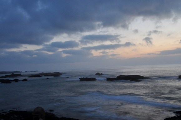 Het ligt aan Sidi Ifni en zijn atmosfeer: de oceaan, laag beneden de klif, met een kale camping eronder met wat campers en een zee die rustig golvend in en uit loopt, mannen alleen of samen en groepjes vrouwen en hier en daar een stel hangen aan de balustrade en kijken naar de zee. Wat gaat er door ze heen? En wat door Steve? Diep peinzend tegenover me.