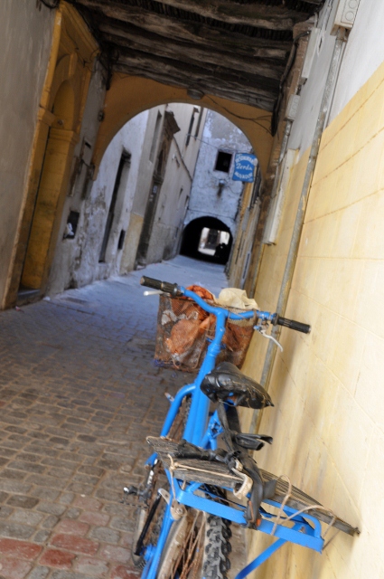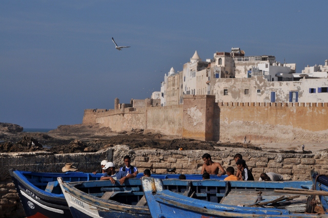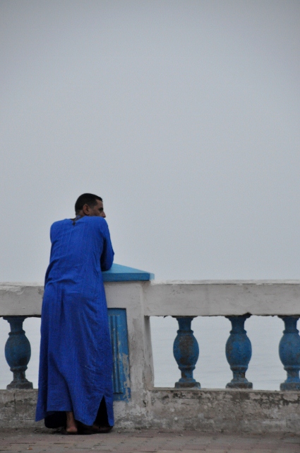 Zittend op het hoogste dakterras komt Steve me melk en zoetigheden van de bakker brengen, drie stuks, mijn ontbijt. En ik heb het verdiend. Ik heb de dag dat ik hierheen kwam veel gegeven, veel terug gekregen en dat zet deze dag dus door. Nu zittend op de bovenste verdieping van een oud Portugees huis, in de ommuurde medina, een goed verzorgd Marokkaans huis. Wat een verschil met het platteland. Dit is rijk leven! Deze stad is zó mooi, het is niet voor niets zo toeristisch. Ommuurd met een stevige, niet verkruimelende muur. Een dikke, sterke verdedigingsmuur, hoog en machtig. De huizen erin Portugees, alsof zij verkleumd hun hoofden over de kraag van hun jas steken, zijn het hun gevels die uitkijken over deze muur, over de oceaan.