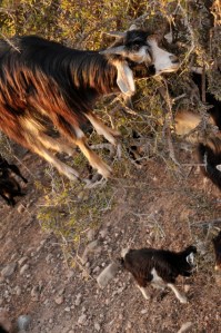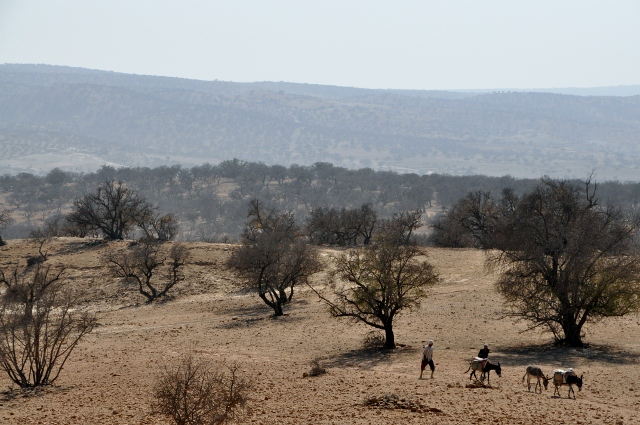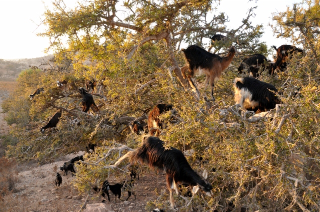 We weten dat er vanaf Essaouira tot aan Agadir geen hotels zijn en we dus ergens moeten gaan kamperen. Blijkbaar is het geluk aan onze zijde want wanneer de zon bezig is met ondergaan, verschijnt er een bordje ‘camping’ langs de weg. We verlaten de N1 en gaan een diepzinnige route tegemoet waar ik al meteen stop! Ik zie boom vol met geiten en de geitenhoeder staat iets verderop een heuvel met zijn kameel. De man draagt een wollen djellaba en nadat ik ongeveer 15 minuten blijf toekijken naar zijn geiten gebaart hij me dat ik beter voort kan maken omdat de zon al bijna achter de berg is gezakt. Hij heeft gelijk, en ik fiets verder. Het is een weergaloos mooie route…