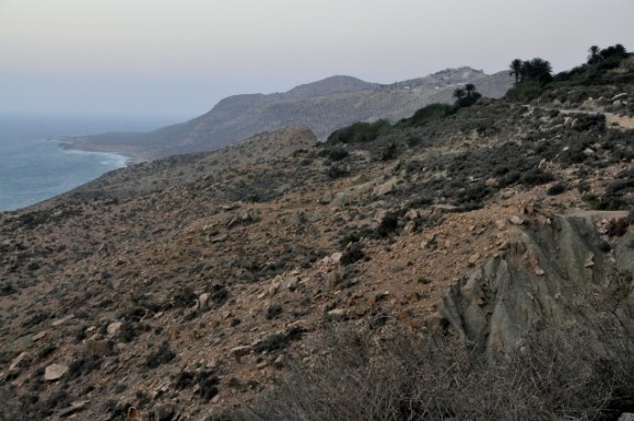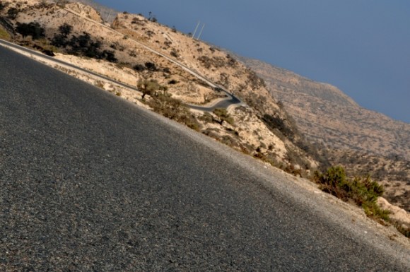 Vanuit de camping naar Agadir wordt een taai stuk. Ik was al ingelicht door Steve die dit soort dingen weet van zijn GPS: 300 meter stijgen op 4 kilometer! Ik heb de helft van de route moeten lopen en duwen, zelfs met het ontbreken van de tien kilo wegend dry-bag. Dan is het sprookje van de dag ervoor echt géén sprookje meer! Dan denk ik: ‘Waarom doe ik dit? Waarom blijf ik reizen? Dit is mijn laatste reis! Waarom ben ik niet gewoon thuis, waar dat dan ook is? Gewoon lekker comfi!’ Om de dag zó te starten, met zo’n klim is echt niet zalig!