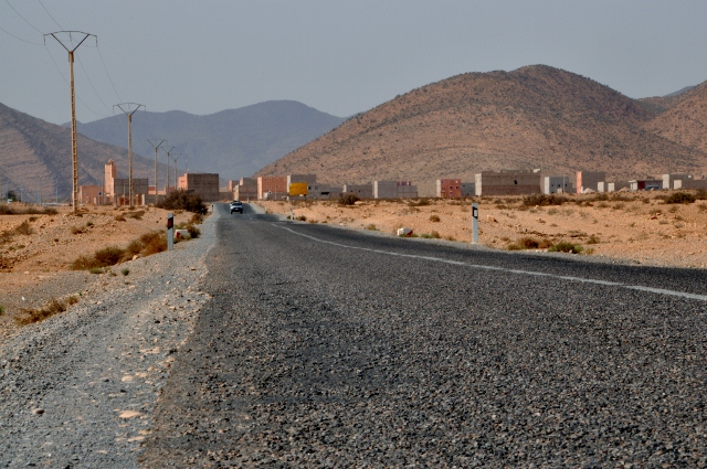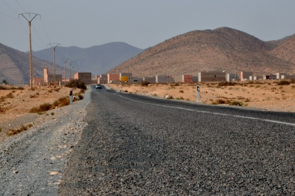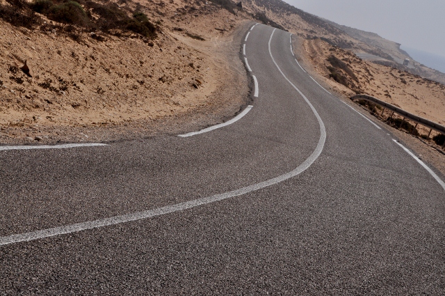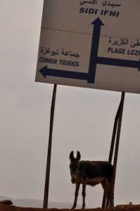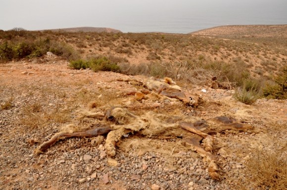 De wind krijg ik hard vanuit het noordwesten wanneer de kustlijn ombuigt en ik een stuk oostwaarts fiets, de oceaan lijkt hier wel een enorme bolling te maken en ik moet mijn ogen samen knijpen om te zien of ik het wel juist zie. Tot de wind me bijna van de weg blaast en het drukke Agadir verkeer agressiever en iets onvriendelijker is dan de rustige kustroute. Mooie appartementen worden gebouwd, om over een paar jaar te vervallen, te verpauperen tot er nieuwere, betere, duurdere worden gebouwd. De route blijft vuil: pakken melk, kleine roze bekertjes yoghurt, pizzadozen, pakken melk, drinkyoghurtkartonnetjes van het merk ‘Young’, suikerdozen, stenen, stukken huis, netten in prikkelbosjes, enorme stank van rottende vis en natuurlijk de dode dieren. Dode ezels zijn orde van de dag, daarbij nu ook een opgezwollen wilde zwijn en honden die van de ingewanden van gestorven schapen smullen.