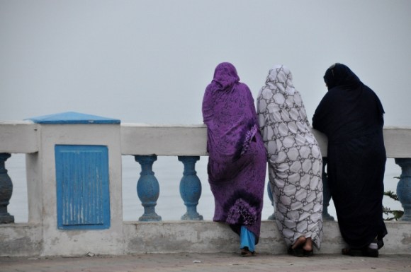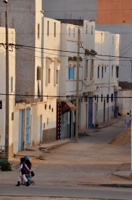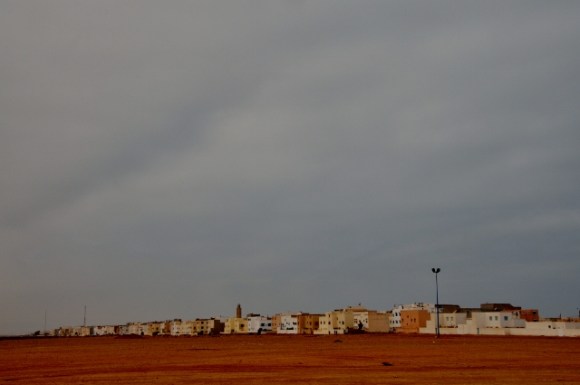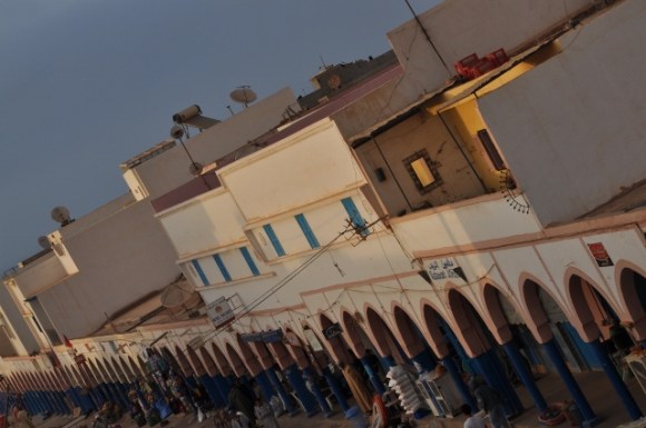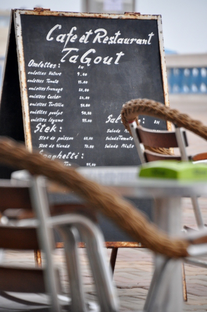 Dan vertrekken we samen verder naar Sidi Ifni, een heerlijke plek, voormalig Spaans, pas terug gegeven aan de Marokkanen in 1969. We eten in een verlopen oud, muffig restaurant dat waarschijnlijk na de Spaanse teruggave nooit meer echt schoongemaakt is. Maar het eten, een tagine poisson en cous cous legumes is vers klaar gemaakt en smaakt goed. Er speelt een aparte mix van muziek op de voorgrond. Art Nouveau gebouwen in hun zachte pastels omhuld door de koele zeewolken waardoor de herfst zijn intrede heeft gedaan. Er zijn heerlijke zoetigheden te verkrijgen en oude, antieke koffiemachines zijn nog altijd in gebruik. Het ontbijt in een cafeetje is perfect, een Sahawari volledig in blauw gekleed komt binnen, de ruisende geluiden van een levendig restaurantje, de Franstalige radiozender, mint thee en vers stokbrood. Het is helemaal de juiste setting. Mijn lichaam dat precies in orde is. Ik voel me heel shanti, stoned bijna. Aan het ontbijt, een mint thee uit een glas van ‘Café La Mousse Blanche’ en wat zal ik deze mint thee gaan missen. ‘Kiss my whistle baby’ klinkt door de luidsprekers van de radio, een geheel Franse uitzending en ik vraag Steve wat dat betekend: ‘kiss my whistle? Does it mean kiss my penis?’ Een beetje opstandig voor een Marokkaanse zender, denk ik. De oude hit ‘I will survive’ met Destiny’s Child ertussen door geremixed klinkt dan toch beter.