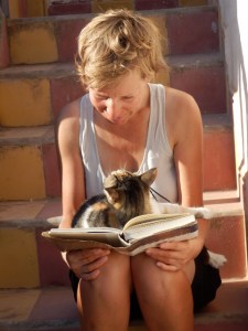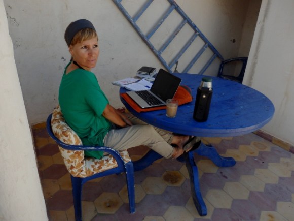 En wanneer ik dan bijna drie heerlijke dagen alleen ben geweest verschijnt Steve weer. Ik vind het prettig om hem weer te zien. De eerste avond samen is aangenaam, samen met de Franse eigenaar van het hotel en zijn jonge Marokkaanse vrouw zitten wij tegenover hen aan een blauwe houten tafel terwijl poes Sikoutine tussen ons schippert en blijft hangen op een stenen afscheiding tussen ons in. Ik ren de deur uit om aan mijn plotselinge behoefte van chocolade en yoghurt te voldoen en het voelt alsof we een thuis hebben.