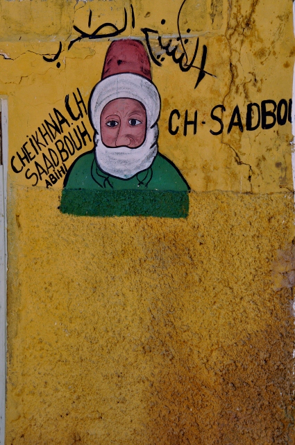 Zoals in alle Senegalese huishoudens sieren vele afbeeldingen van de geestelijk leider, Cheick Amadou Bamba, de muren. Of is het Cheick Ibra Fall? De eerste de stichter van de Mouride stroming diep binnen de islam, de laatste zijn volgeling en later een spiritueel leider. In het begin is het raar om deze afbeeldingen te zien, omdat er binnen de islam geen personen of dieren afgebeeld worden. Maar hier zie je deze twee mannen overal op geschilderd, mannen met bovennatuurlijke krachten die tussen Allah en het volk staan om Zijn leringen door te geven. En hier zit grootmoeder met een grote, hippe zonnebril op haar hoofd, vast omdat er niets anders te verkrijgen is in modebewust Senegal. En daar zit ik, zo graag meer willen weten over deze Cheicken, maar ik spreek er te weinig Frans voor.