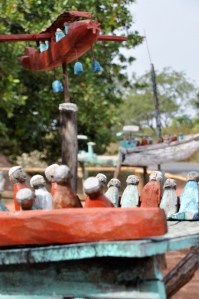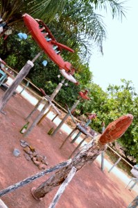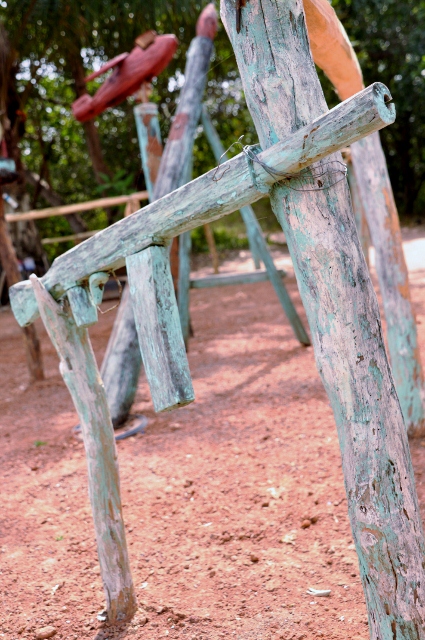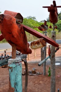 Lonely Planet says this about the artwork of Ngala: He has fenced a part of the roadside and created the world. It’s a small, thought-inspiring universe built from stone, brick and recycled materials. Just like that, to please those who pass, and make them think a little. Christian crosses stands next to a toy town mecca, pace doves flies over huge bazookas, and dozen of wooden sculptures of policemen, soldiers and two headed women people the place. Ngala’s world is certainly marked by the many struggles his country has seen.