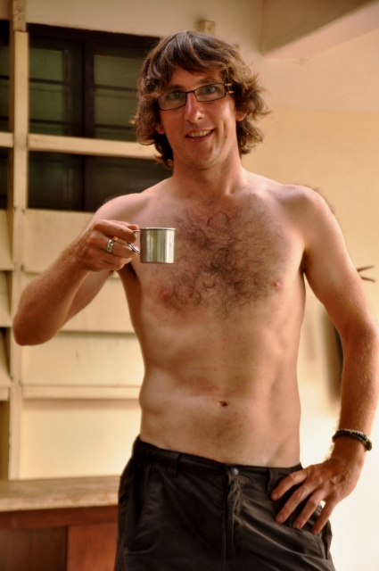 Zegt de man van een hotel ergens aan deze lagoon. Ik ben ondertussen op de grond gaan slapen wanneer de eigenaar van dit hotel Oliver toespreekt en ons een kamer aanbiedt. Charmant als Oliver kan zijn zegt hij dat hij liever in een tent slaapt omdat dit de muggen tegenhoudt en omdat betonnen kamers altijd zo heet zijn en omdat de douches ook vaak te wensen over laten. Hij vervolgd met ‘a tent is actually much better than any hotelroom.’ Ik ben ontwaakt en zie de hotel eigenaar zich zelf afvragen of hij Oliver zijn commentaar wel goed heeft begrepen. ‘I offer you a free room, you don’t want that?’ Gauw laat ik mijn vermoeide doch aanwezige vrouwelijke charmes maar los: ‘We are very honoured with your kind offer but we can not accept. This is too much. All we want is to put our tents on your compound. That would make us more than happy!’ en hier mee gaat de man akkoord, mits we tenminste een douche accepteren. Deal.