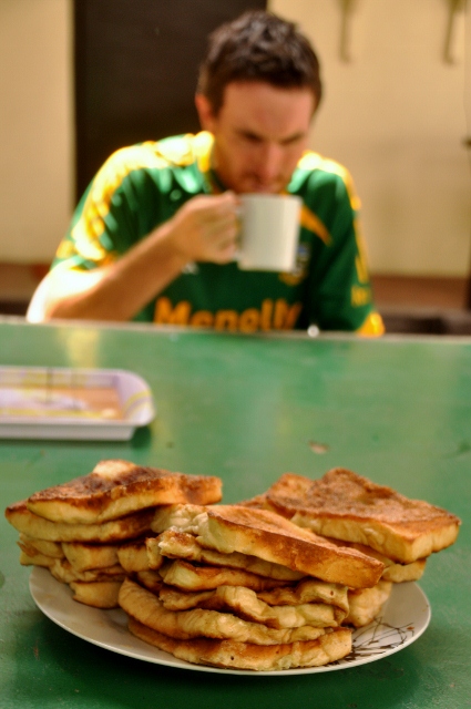 Ergens rondom een kruispunt hebben we het geluk een Chop Shop te vinden die zowel koffie met melk en brood met omeletten serveert, ideaal want we zijn opgestaan om half 6, vertrokken om 6.15 scherp, na een nacht niet voorafgaande aan avondeten. Hier zit een jongen waarmee we in een kort gesprekje raken: ‘People in Africa are starving,’ zegt hij. ‘Oh,’ denk ik, wetende dat hij een verpleger is, vraag ik het volgende: ‘You are a nurse. Then tell me, how many people with diabetes you have in your hospital?’ De jongen die zegt dat mensen in zijn land dood gaan aan honger antwoord: ‘Oh, many!’ en Oliver vraagt daarop hoeveel mensen er sterven aan honger in zijn ziekenhuis. Zijn reactie laat geen seconde wachten: ‘None.’