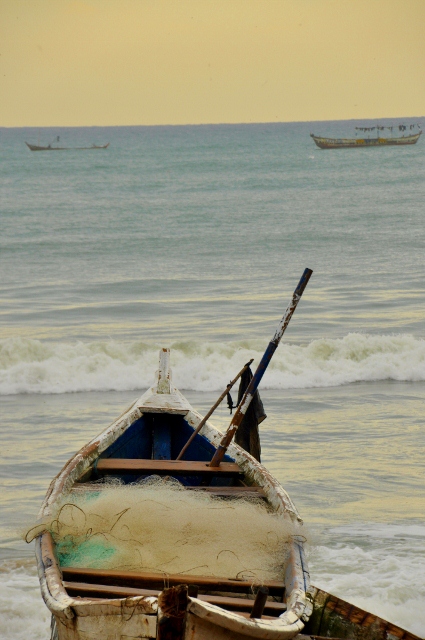 Ik ben niet laaiend enthousiast over het resort Big Milly’s Backyard, hoewel Engelse Wendy een erg fijn persoon is, is het toeristisch en zijn de prijzen in het restaurant naar verhouding. Toch, niet het gehele verblijf in Kokrobite, 6 nachten voor maar €1.80 per nacht in mijn tent, is onplezierig. Ik slaag erin, hoewel met enige curieuze bezienswaardigheid, thee te brouwen. Zittend op de zanderige grond, voor mijn Primus gasstelletje prepaar ik de heerlijke masala thee wanneer de zon nog doezelt en aarzelend over de palmbomen tot ontwaken komt. Ik zet me neer op een stoel en ben zowaar in staat om te lezen. Als Oliver niet ook een stoel naast me bezet, dan aanschouwen we de vroege, zacht warme ochtend samen. Ik moet glimlachen als ik witte lichamen over het zand voor me zie lopen, niet gewend aan lopen op blote voeten is het alsof zij op hete kolen balanceren. Ik heb bedenkingen als ik een auto zie staan die medicijnen uitdeelt in Afrika, mijn mening helemaal niet positief meer. Bedenkingen bij het zien van de enorme grote Bedfort truck waarmee 15 Ijslanders en Zweden overland gekomen zijn. Ooit een truck om stieren en hengsten te vervoeren, dezelfde route als ik op mijn fiets heb afgelegd. We bekijken de mensen die minder een doorgewinterde reiziger zijn, inclusief de Bedfort truck mannen, die twee emmers water nodig hebben om zich te wassen. Is het mijn arrogantie? Ik merk op dat de lokale mensen in toeristische plaatsen blasé zijn geraakt en ronduit onvriendelijk zijn, en dat toeristen zelf vaak een stalen uitdrukking bezitten, onpersoonlijk overkomen en geen emotie tonen.