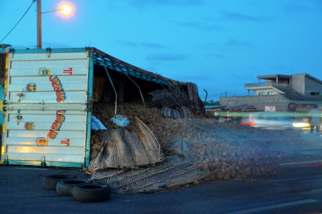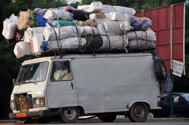 De route naar Cotonou laat me veel stoppen om te eten, zo vaak dat Oliver die op me wacht aan het begin van de stad zich af begint te vragen of ik hem wellicht al voorbij ben? Ik heb energie nodig; een hele ananas, 6 bananen en 2 baobab drankjes, na het bord spaghetti en 3 thee met gesuikerde melk. Dan begeven we ons in het verkeer van de hoofdstad en automatisch vervallen we weer in een wedstrijd, hij gewend zijnde te fietsen in New York, en ik win altijd in de stad. Wat een heerlijk gevoel! De route leidde me langs vele omgevallen trucks die mij huiverig maakte dat er ook een mogelijkheid bestaat dat ze op mij vallen. De stad verlicht deze angst, maakt me blij met de overdaad aan prachtig textiel zittend op de vele motorbikes, vrouwen met de mooiste pruikjes, mannen met trotse blikken.