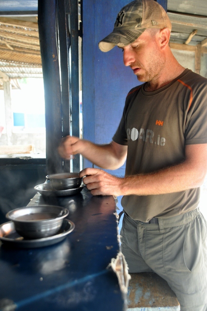 Ik heb eerst 7 kilometer over heuvels te gaan vooraleer ik op een ontbijt stuit. Nu is 7 kilometer te overzien, was het niet dat dit het eerste eten is na de dag ervoor alleen een ontbijt te hebben gehad! Ik neem twee omeletten en twee borden vol oud brood, twee thee met gesuikerde melk en dit alles terwijl een man aanhoudend blijft schooien om geld. Vriendelijk knik ik hem toe dat ik niets geven wil en als hij met een onechte blik van medelijden blijft toekijken hoe ik eet, keer ik hem de rug toe. India welt plots op. De mannen rondom me worden boos op de schooier en gebieden hem weg te gaan. Ik heb even helemaal geen zin in gedoe. En gedoe hebben we: welke route gaan we nemen? Nemen we de route die we al twee keer hebben gefietst of een nieuwe, die over het meer gaat. Welke pirogue gaan we nemen, want er wordt een belachelijk hoge prijs gevraagd die we weigeren te betalen. Welke track gaan we nemen als we niet de teerweg willen pakken? Oliver weet het ook niet. We vragen rondom ons en iedereen wijst maar wat. Plots ben ik de locals zo beu, alles is zo onprofessioneel en we worden zo vreselijk afgezet, alles gaat zo langzaam. ‘Yes, just like you,‘ zegt Oliver en ik ben terug op mijn plaats. ‘I am sorry, just follow me, trust where the locals point us to,’ en zo volg ik Oliver over de rode piste. Het wordt een prachtige, hete rit waar ik nu eindelijk de locals goed leer kennen. Ik vind ze leuk, ze zwaaien uitbundig en er heerst geen ‘donnez moi‘-cultuur. Maar ik heb Lucky Dube op gezet dus eigenlijk kan ik helemaal niet zeggen of er geen ‘donnez moi‘-cultuur is.