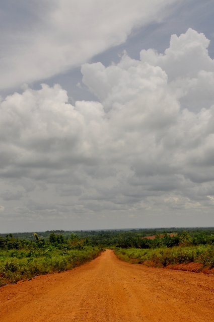 We fietsen met ons drieën verder, over vlakke wegen, langs curieuze standbeelden die onze aandacht vast houden, iets dat ontblote lokale vrouwenborsten allang niet meer doen. Soms beeld ik me in dat ik hier pardoes geplaatst ben, en zie ik de schoonheid van een glanzende zwarte huid met twee bengelende borsten, sterk in contrast met de felgroene natuur waar zij langs wandelt. Ik ben verbaasd over Benin zijn landbouw, verblijdt dat zij hun leven vergemakkelijken door sproeikoppen te plaatsen op slangen waar de velden het water gretig opslokken. Er zijn zelfs complete sproei installaties die velden bewateren, de mensen die de velden bewerken zwaaien optimistisch.