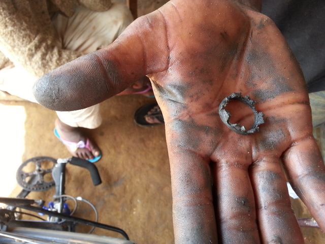 It’s a sunny day and funnily I don’t mind my bicycle is broken. I mean, I dó mind but the fact that I am now walking is one to be dealt with. Fine as it is. At least the bicycle is still rolling. And so I walk on. Soon I pass a shack. The men are all drinking out of little plastic sachets, some people call this ‘medicine’, and they help me. Put me on a Toyota pick-up truck, tell me the fare in advance and off I am. Once in Poema, the driver of the pick-up truck brings me to bicycle repair man. Once again, all these men say they are professional, but with the lack of tools they act as if they aren’t. First I need to buy my own wrench because they don’t have it. The young guy manages to get the bearing out of the bracket. With a lot of massive hammering again, but what choice I have? Only to find out there’s no replacement to be found. I have to go to Yaoundé by minibus. The mechanic brings me to the road and arrange a seat for me. In no time my bicycle is up on the roof again, I packed as a sardine underneath it…