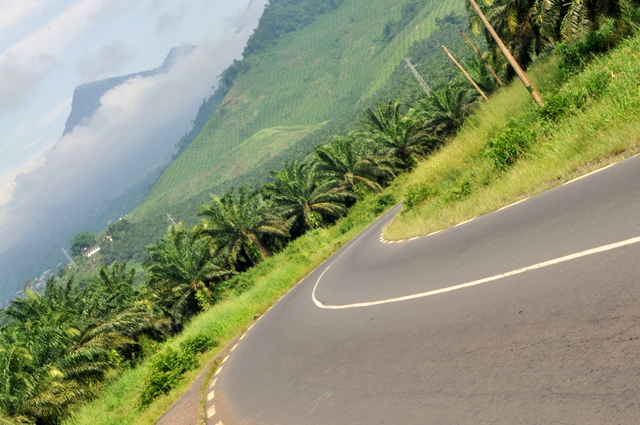 That’s where I am heading to, a Catholic mission, the cheaper options to stay the night. From Limbe I cycle out of the lowlands, climb a bit and be stunned by the pretty mountains surrounding me, heading to Douala. I am pressed in by rubber plantations, banana plantations and a lot of palm-oil sales points along the route. Little food though. When I do find food, it’s a delicious groundnut soup with four fresh fried fish. I see people around me watching me, their expression blank. I notice Cameroonian, not uncommon, support closeness, seem to be glumly, I sense fearfulness even.