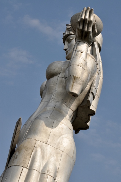 De nooit aflatende aandacht en smeekbedes en ongezegde treurnis van de Afrikaan zijn ingeruild voor iets waarvan ik nog niet weet wat. Waarom roepen sommige mannen me na? Hoor ik een bedelende toon? Ik zie nogal wat zwervende mannen, zoekend naar eten uit vuilnisbakken. Ik ben een blanke onder de blanken en hoewel op de fiets een bezienswaardigheid, toch geen witte alarmbel waaraan denkbeeldig getrokken hoort te worden. Ik moet wennen aan het feit dat ik een rijkere persoon ben dan de doorsnee inwoner van dit land, ook al ben ik van dezelfde kleur. Het stukje stad waar ik beland doet anders vermoeden, wordt gedomineerd door Rustaveli Avenue, een grote weg met statige panden, dure hotels en chique winkels waar ook MAC make-up, Yves Rocher en Zara vertoeven. De supermarkten hebben lange korrels zwarte rijst en zakken vol boekweit, vrouwen zitten op de stoep met vers fruit en bij de kerkjes staan zij vooral nootjes te verkopen, druk doende het laatste nieuws met elkaar uit te wisselen. De stad word opgesierd met vele kunstzinnige en heroïsche beelden, Mother of Georgia is er zo een, zij staat op een heuvelrug trots haar zwaard en mandje druiven naar ons toe te zwaaien. Ik beklim de heuvelrug om dichterbij haar te komen en op mijn pad kom ik een sissende slang tegen als ook een alleraardigste taxi chauffeur, hij legt me uit dat de mand vol druiven voor de gastvrijheid van dit land staan en het zwaard ter verdediging. Alweer valt me op hoe vriendelijk en lief iedereen is, hoe men met een lach en een grap klanten probeert te winnen, of hoe rustig en aardig een bedelaar geld vraagt. Ik zou opeens iedereen wel iets willen geven of iets van ze willen kopen. Ik begin nu zelfs geduldig uit te leggen dat ik echt niet iedereen iets kan geven omdat, en een lang verhaal volgt, terwijl de luisteraar in kwestie nooit geen Engels verstaat. Een geduldige lach is het antwoord.