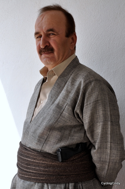Again I am in a police station, this time it is for a peaceful reason. Once allowed inside my eyes are wandering. Over the perfectly cut traditional suit of the head officer. His pusben is wrapped neatly. All is outfitted in a dark brown color with a dark blue blouse underneath. The pusben is made of a brown voile, a very thin see through kind of textile. His salwar has a low crotch and is wide, so wide it doesn’t give away any shape of the man. The jacket over the blue blouse is sharply cut, fitting his body nothing less than perfect. It reminds me of many styles poured into one, becoming the Kurdish. The man himself is a bit older and handsome. I watch him. He looks at me, trying to get an idea of me. He must find it all very strange. As I watch the corner to the officer his right, I see a few machine guns as well as heavy artillery. I feel safe. To me it occurs this is a machine gun to trow granates and I come to the conclusion I am once again deep into the culture of a land unknown to me. I like it. We are surrounded by military men dressed in khaki and faded green, their T-shirts badged with US ARMY. I have to keep myself quiet, would like to make photo’s here. The roughness is touchable, and the reason we are here is plain funny. Rasool and me want permission to share a room.