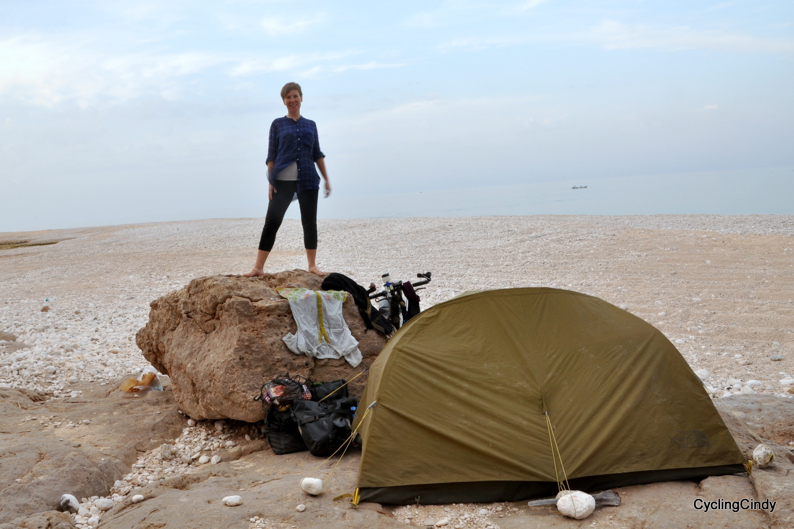 The coast, which was one of my dreams to camp on, turned out to be one of the most disturbing. Not only because of the fishermen their bad luck but of all the sounds. Crickets never seem to have chirped so incredibly loud as here in Oman and shadow is impossible to be found if there are no trees or sheer rocks. Within a week I dressed from woolen fleece jacket to tank top. Obviously, I don’t wear the tank top in public, only in private camp, but by seeing the same fishermen coming back in the morning I quickly dress up more decently. Not because of the concern of rape, that has gone altogether with the arrival of daylight.