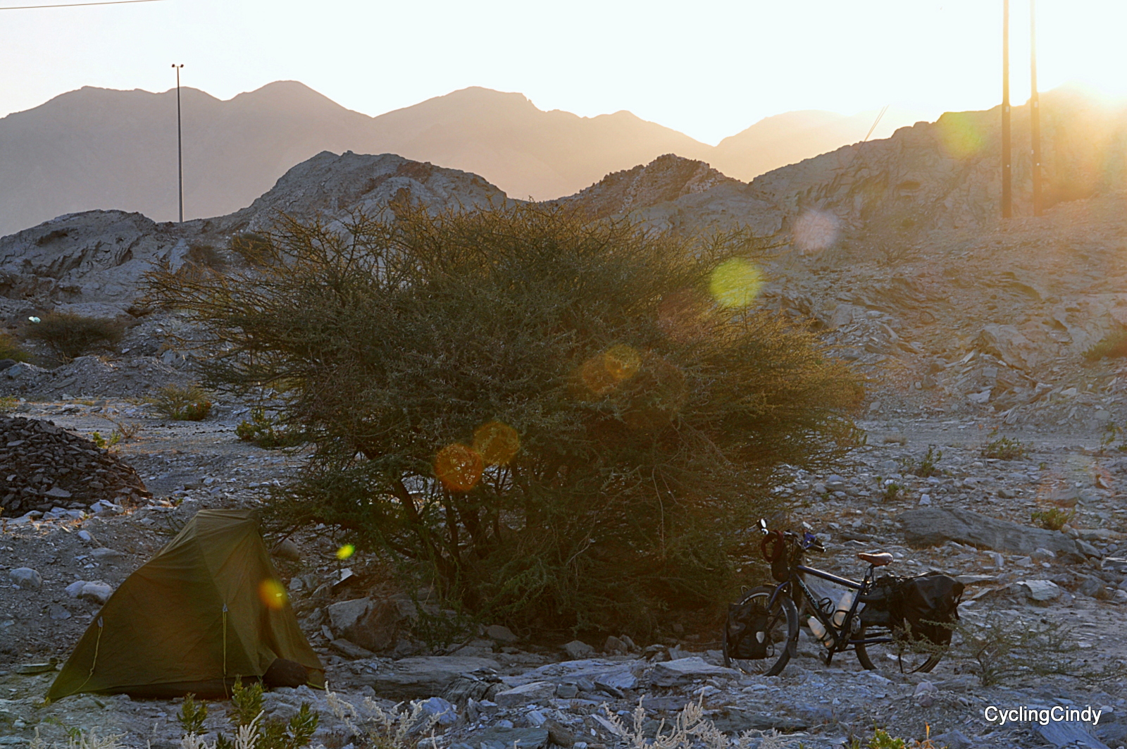 Each day the knowledge of a bright shining sun is energizing for the heart and mind, but most of all, the camping is what I treasure most. This life style of a nomadic, however made up it may be, feels natural. Thinking about all the abandoned donkeys, I would never turn my back on my bicycle. A car surely is faster and the unsophisticated power of a donkey or bicycle can never be compared to mechanic power, thus donkeys and bicycles has become superfluous. The semi nomads of Oman and the Emirates love luxury -not that I blame them, as I was born into it- and it seems they must have always been halfhearted the inhabitants of this desolate part of the world. Perhaps they always loved luxury and as nomads had an exorbitant life style already. Perhaps those people just want something else as were they are born in, just like me.