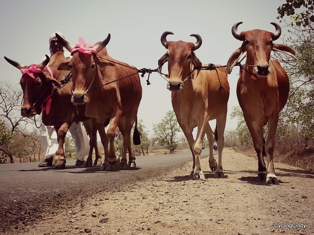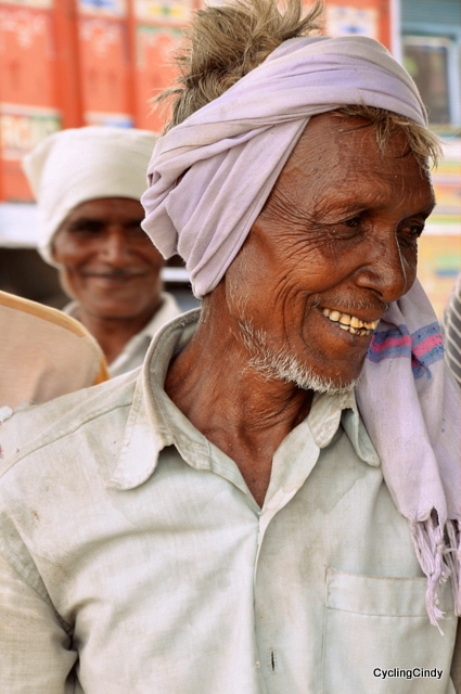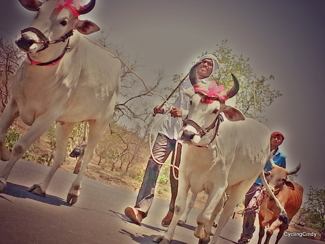 When I have left the beautiful national park, mostly beautiful because there’s nature without any form of humans touching it, I reach into Madhya Pradesh, and pass a cow market. Hundreds of cows are being sold here, some have orange henna dots on their massive body, but most are dressed in pink, as that is the dress-code. I stop, try to balance my bicycle on it’s broken stand and people ask me to come and photograph them. All these farmers are proud Indians, and with reason: their stock looks healthy, their fields immaculate. These men are hard working people and I so respect them, not only for that but also because they dress themselves so fantastic. All in white, a doti draped artfully between and around their legs, still a garment from the middle 1900’s when Ghandi wore it. The tops they’re wearing is stitched neatly and the cut almost Rajasthani style. The men wear golden earrings and turbans. Their cows pull wooden carts, painted happily, and are taken good care for. But when one cow is having diarrhea I point at her stomach and say ‘no good, problem’. The answer is the heat. Its a little above 40 degrees now and although each day when I take off my turban, it’s drenched. Yet cycling is still comfortable.