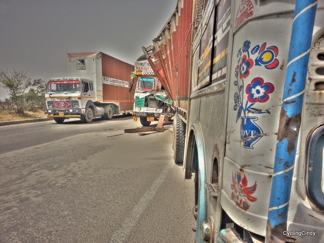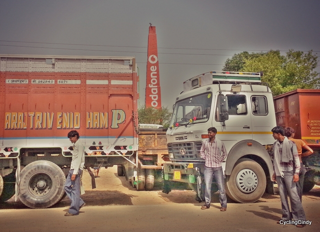 My plan was to make a detour of two days towards a picturesque village with colorful painted haveli doors. Being in Bundi and entering Delhi from the West this seems to be a very nice plan indeed. I think it’s best to avoid the Express Highway from Jaipur to Delhi. A big red line on the map, surrounded by countless little other lines from yellow to white and pink. A tremendous populated area. Best to avoid and stay some longer in atmospheric Rajasthan! But the heat. That damn heat. It leaves little energy for sightseeing, and so where I’ll end up is exactly there: on the terrible crowded, uninspiring dusty highway connecting two massive cities. Cycling from Jaipur to Delhi. A part of the so-called golden triangle, a triangle of golden dust, golden heat and golden sun-kissed drivers of Tata, Ashok and Eicher trucks