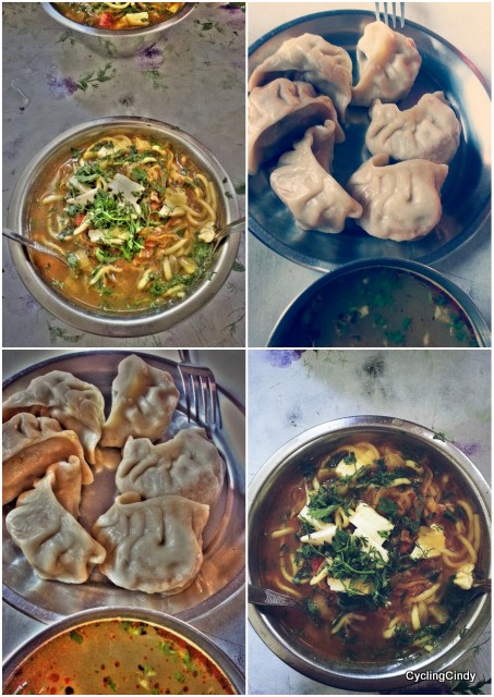 The nature is one of soft colors together with brownish rocks and gravel. Brushed greens are dotted against the slopes and spread minty smells of fresh herbs. I reckon they’re all good for making tea. If I only had a tiny bit more time for that… The road bends constantly in swirly curves like a trained woman’s body and when a battered state-transport bus comes ahead or from behind, the driver know better than I how to maneuver around a bicycle. Truck drivers indicate with a tip of their fingers what is required of me. People and food is slowly changing from Indian to Chinese alike, to momo’s and chow mein, prepared by woman wearing the same cap as a man. I notice an equality for the first time, where men and women wear the same headdress -it says a lot. Cows are slowly disappearing, as riksja’s do too. I enjoy the ride while eating loads of deep-fried potatoes in an almost hidden shack a little below the road, my bicycle resting against a tree overlooking the road…