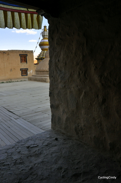 I had imagined Tabo to be a Tibetan like village with the monastery perching high on top of it. When we reach it I am sure this is not Tabo yet: the village is spread out and although the surrounding is wide open there’s no such thing as what I had formed in my mind. The gompa is low and invisible. The atmosphere is dead because all monks have left for Leh, where the Dalai Lama is. I am highly disappointed by reality, or by my mind who made things up again, though the authentic stay in an old crumbling part of the monastery compensates for it. The ambiance is full tangible, with a blue ceiling and yellow windowsills, the floor moves when I walk on it. There’s hardly any electricity but that’s not discouraging the many STD and super-fast internet-cafe’s to have their business open, alas completely down of any service.