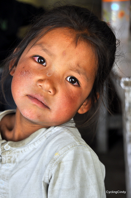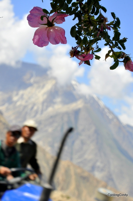 Nature goes from narrow canyons to a wide open riverbed and suddenly there is plenty of perfect camping spots to choose from. Scenery has changed a lot, the feeling that I am in a Tibetan world is omnipresent. Children with red cracked cheeks, faces full with dirt, playing outside, our bicycles are a high-tech toy for them. Chorten and mani walls are now everywhere and we always try to pass them from the left, the direction in which the Earth and the Universe rotate. There is very little traffic on these roads, hardly any trucks and an Enfield motor pass me now and then. Roof of houses have hay on them, life seem to be prepared for the harsh winter, the smell of thyme is often, and colorful flowers erupt at the strangest places. The spirit of trekking in Nepal is strongly present and it is a wonderful feeling.