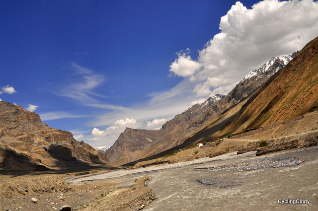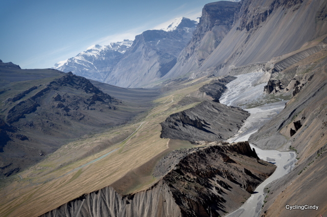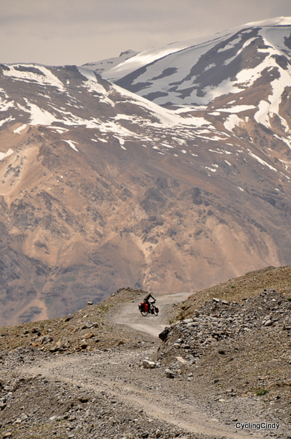Kunzam La pass is awaiting me. Not being acclimatized, being ‘hungry’ almost all of the time, I lack energy. I have never cycled over anything more than 2500 meter and now the last 400 meter of 4550 meter are to be done. The road is gradual, only in a few places steep. I am pushing the bicycle often. I am not enjoying really but the thought I have outdone myself almost double in altitude makes future cycling less demanding. I hear my companion scolding too: ‘Fuck, it’s even further’ or ‘forhelved‘ many a times.