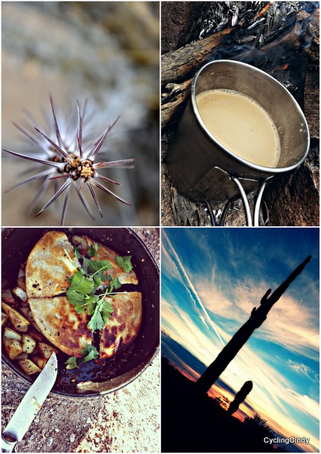 It is amazingly special to wake up and having my eyes wander toward the huge saguaro, erecting sky-high from my frog-perspective. These cacti seem to be elderly wise from the Aztec-era. They seem to withstand everything: cold, rain, dew, soaring heat, wind, drought. As if they oversee it all, as Queens of the Desert. Waking up under the stars, not covered by a tent, I wonder whether they took an important part by the local people such as the baobab does in Africa. To be amongst those enormous cacti is a treasure, like eating corn tortillas is, like drinking Ophra chai, like finding another Alternative Baking Company vegan cookie, like a blueberry bagel, like seeing my bicycle, and like being here is…