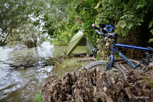 Although I am an independent cyclist, to such an extend I almost look down on following a mapped cycle route, I do like following arrows pointing me down the EuroVelo route 6. But finding camp spots along it is not always easy. Sometimes I end up between active beehives. Sometimes I need to cross big fields reaching to the grown edge for hiding. Now I end up on a narrow track overgrown with blackberries, passing through a pool with frogs and ending at an incredible small patch of wet, sandy riverbed.
