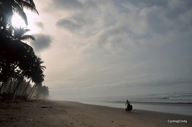 Het plaatje is geheimzinnig rustgevend, in tegenstelling tot de werkelijkheid. De grens van Ivoorkust naar Ghana is lastig. Allereerst schiet een grenswacht met zijn geweer in de lucht om ons te waarschuwen dat we een grens oversteken. Daarna ontdekken we dat deze grenswacht geen stempel heeft voor onze paspoorten; de zilte lucht heeft zijn stempel uiteen doen vallen. Vervolgens duwen we onze fietsen voort tussen Ghana en Ivoorkust en terug naar Ghana over een rul strand. Enkel om te ontdekken dat de Ghana grenswacht extra geld wilt omdat we ook op onze tweede poging geen stempel in onze paspoort hebben van Ivoorkust. Hem overbluffen is nu wat rest!