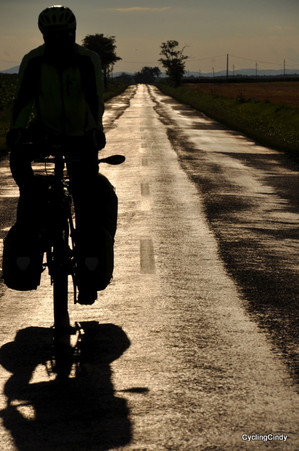 Ik heb altijd gezegd dat fietsen in Europa iets is dat ik zal doen wanneer ik 70 ben. Nu, door bepaalde redenen blijf ik liever even actief in Europa en ik ontdek dat er geen beter moment is dan nu. Juist nú ontdek ik de authenticiteit die er nog steeds is, maar hoe lang nog? Toch, fietsen in Hongarije betekende ook een uitermate saaie omgeving voor mij. In zulke situaties probeer ik mijzelf uit te dagen om toch vooral iets moois te ontdekken. Ik geef mijzelf dan de opdracht om een foto-van-de-dag te maken. Hier trekt het late licht me, waar de schaduw en het grove oppervlak van de weg me het meest treft. Tom fietst even de andere kant op zodat hij als mijn model kan fungeren.