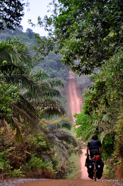 Cycling in West Africa is almost a constant up and down. Here I temporarily cycle with two Irish brothers and a Frenchman. We are an ideal little group of cyclers where I photographed the sporty triathlon-brother on a huge hill. The guys their pace is high, the earth is red and slopes deep … and so it goes, day in and day out.