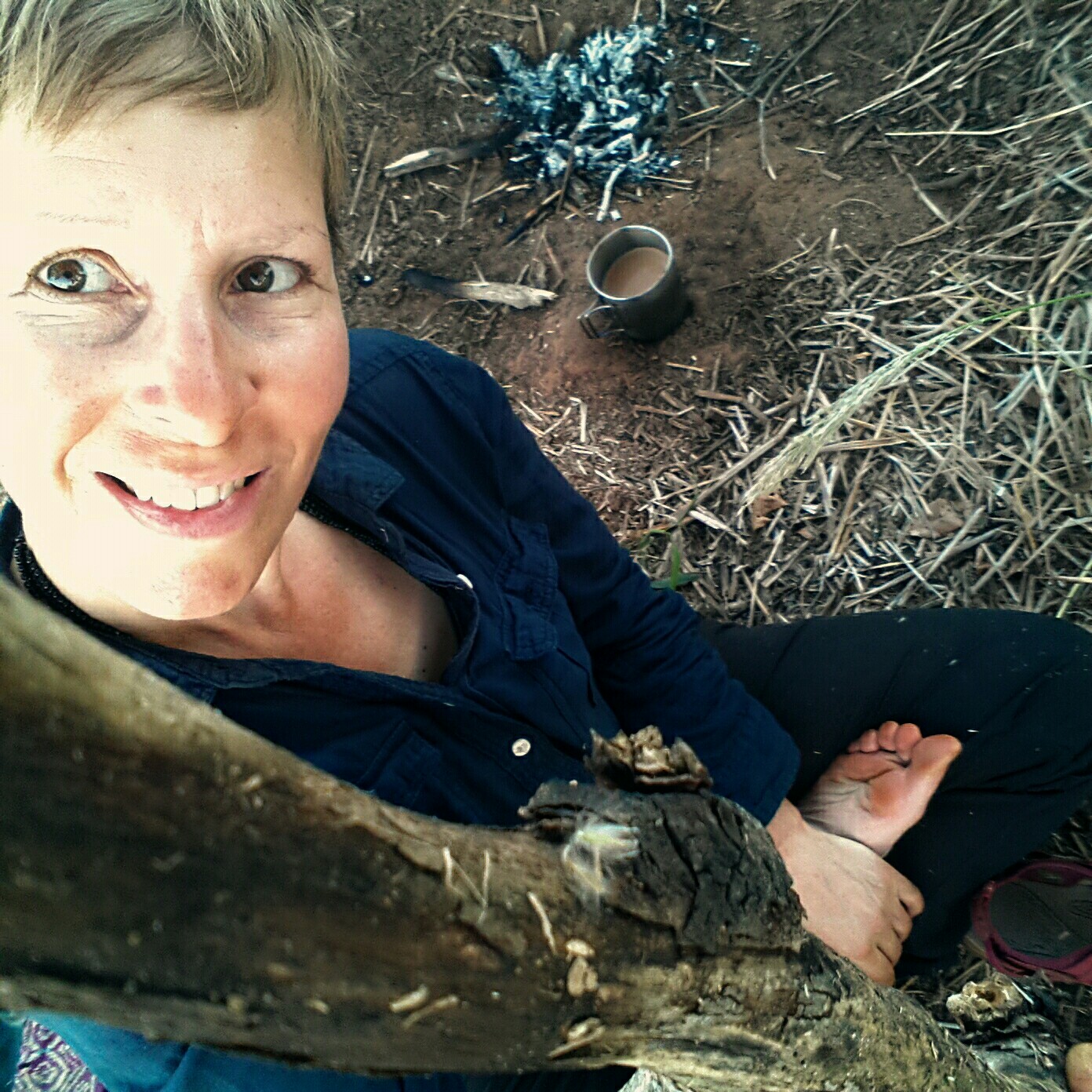 A small fire pit, chai and barefooted selfies
