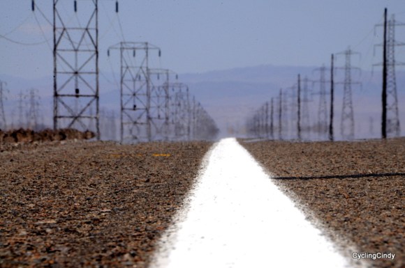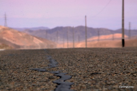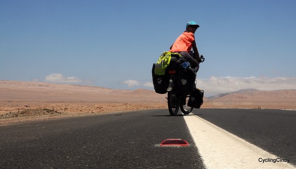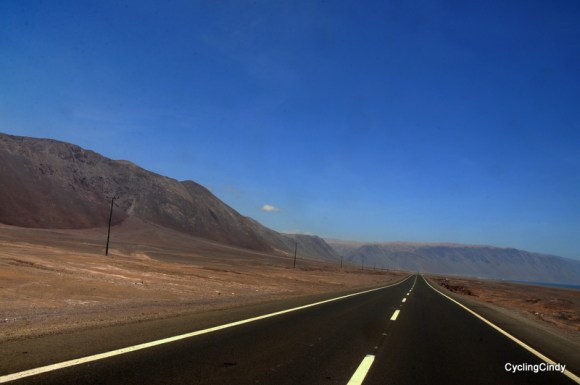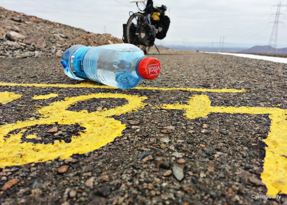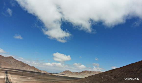 Then I am on the locally called Electricity Highway. Three rows of electricity poles and many old non functioning are lining the road towards Calama. It’s a hideous sight in the otherwise empty desert. Heavy mining trucks with solid trailers pass me regularly, and all traffic does so safely, even when there is no shoulder.