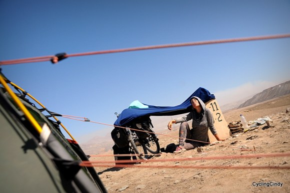 Before camping in the desert around Calama, upon cycling into this big town, my eyes are suddenly attracted to an electronic signboard higher up in the air. It says ‘camping’ and it leads me to the office for the Chuquicamata copper mining tour. The ladies of the office are helpful, as all Chilean people are, and soon I am on my way to a proper camping, a novelty in the north of Chile. I highly enjoy the shower, after 10 days of having none. I don’t enjoy the stray fogs who crawl under the tent fly in search for food.