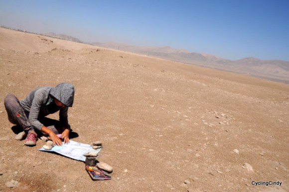 Each day the desert shows a similar scenario: up to 10 o’clock it is quiet, cool and calm. Until 12 o’clock the heat and wind starts to built up. Around half past one the wind is forceful, the temperature is hot out in the sun but almost cold in the shade, as I have built a shady palace from my fleece inner liner. By now all kind of rubble and plastic bags fly over the food I prepared with great difficulty, infused with sand, as the wind blows everything from the town into the vastness of the desert. All which is not secured, placed a stone upon, not hold by my hands or tightened with a needle, blows away. Sand blows in my eyes, through the zippers of the tent.