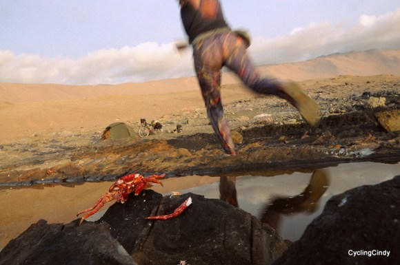 I watch birds, jellyfish, lizards and unknown sea creatures, am attacked by a crab and befriended by two lizards. Each time I set up camp two vultures welcome me, flying over low and let me enjoy the sound of their feathers.