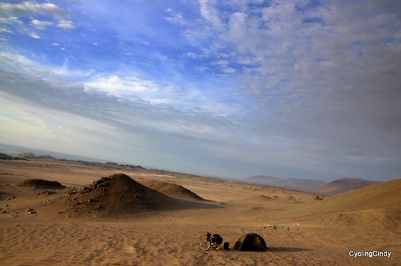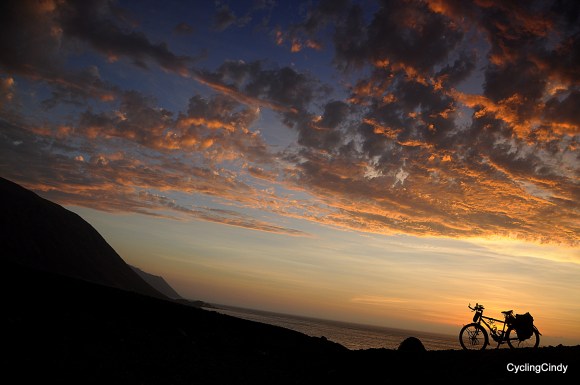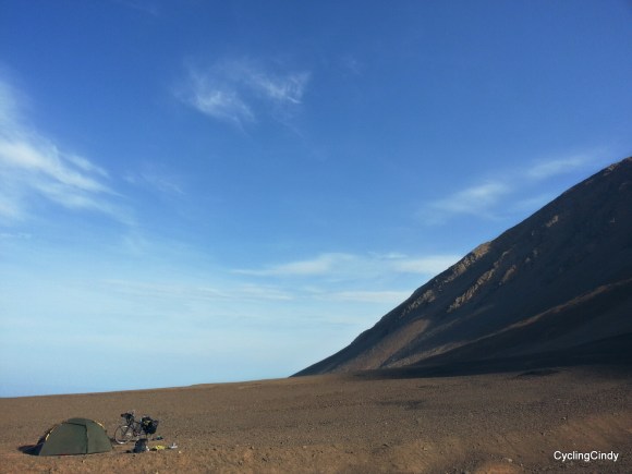 The mornings are the loveliest part of the day. All is quiet, the wind hasn’t make its noisy appearance yet. It is cool and often a thick cloud coverage protects me from the sun. The only sound is the ocean, and the waves makes me wonder at night, as they grow and lessen in sound. With only a thin air mattress between me and the earth I can hear sounds coming from the ground too. The urge to check whether a tsunami is in the making isn’t particular restful, and each time I pop my head out the tent and see a normal ocean, I decide to stuff my ears with earplugs.