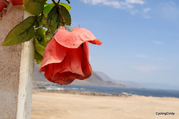 A poor man who has built his hut at the sand dunes just outside of Iquique smiles his rotten teeth at me when I sail past, he waves at me enthusiastically. Young people covered in white sunblock and outfitted with a worn backpack walk along the highway trying to hitchhike. It seems quite a few young people have chosen for a different kind of living. The many jugglers one sees at the stoplight are from Argentina, I am told. They sleep at the beach and live a homeless life, they seem to be part of a large community of flower children. They make adornments from threads, beads and shells. Hippies of modern age, without much money, covered in dirt and tattoos, and accompanied by a dog. I look unclean after 10 days without shower but not yet as bedraggled as they appear.