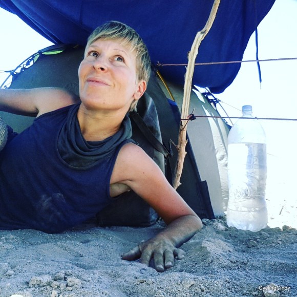 Of course, the wind knocks down my bicycle, to where I tied my makeshift hut. The lid blows off my pan. The tent needs to be taken down. And there I sit: in the full sun. It is insane. All I need to do now is keep calm, practice patience until the hour of 20.00 arrives. I am glad I am alone, would I be with a lover it would undoubtedly turned out in a huge inferno of irritations. On top of it, my Svea stove breaks down and the zipper of the Hilleberg tent splits. Perfect.
