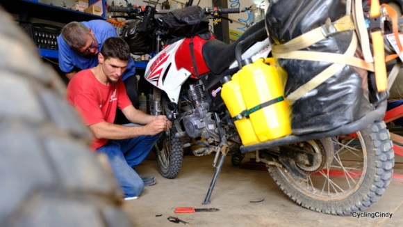Seing back our Kenton motorbike, we realize how much bags we have, and how small the vehicle actually is. Since Geo bought the Chinese motorbike for himself, before we met, it is not meant to be a vehicle for two people including luggage, hauling not only far away distances but great altitudes too. We have to carry spare parts, water, extra jerrycans of gasoline, food, our tents and winter equipment. All our stuff is brought back to a minimum, yet extra racks have to be mounted to carry our gear. To have the option of extra racks attached is very unusual in Paraguay, no one knows how to bend steel into a particular shape, except here in the Mennonite community: Wiens.