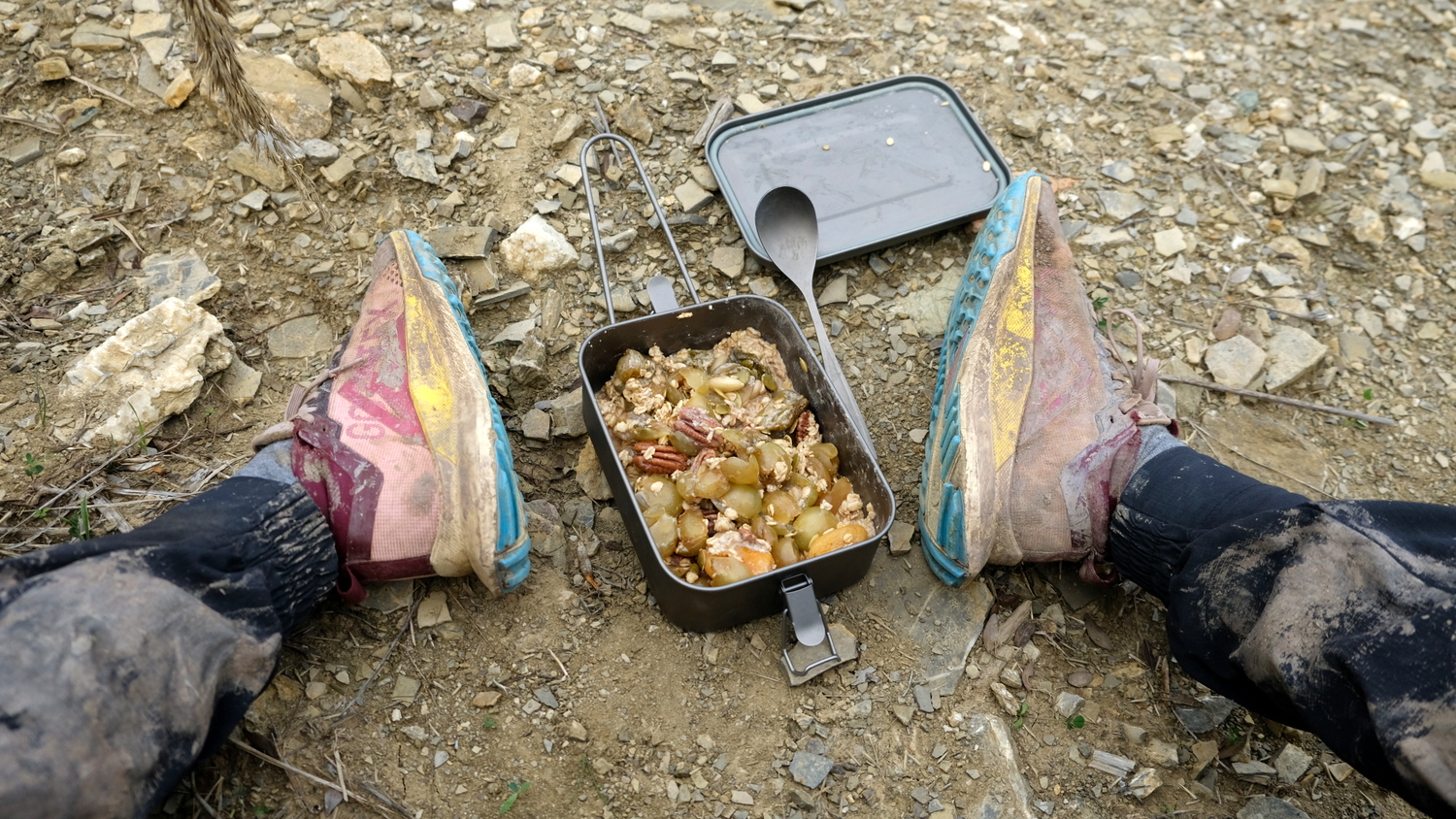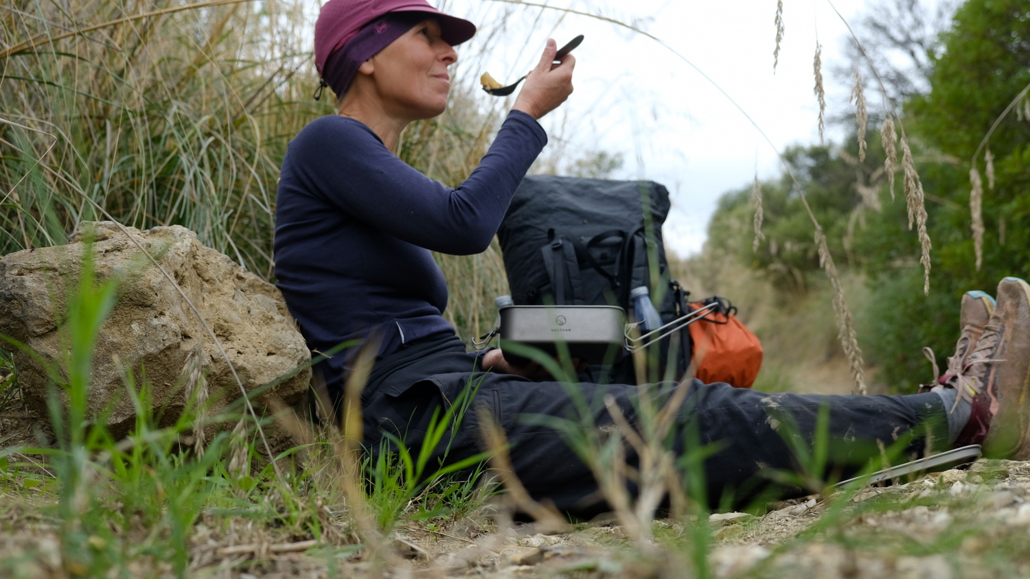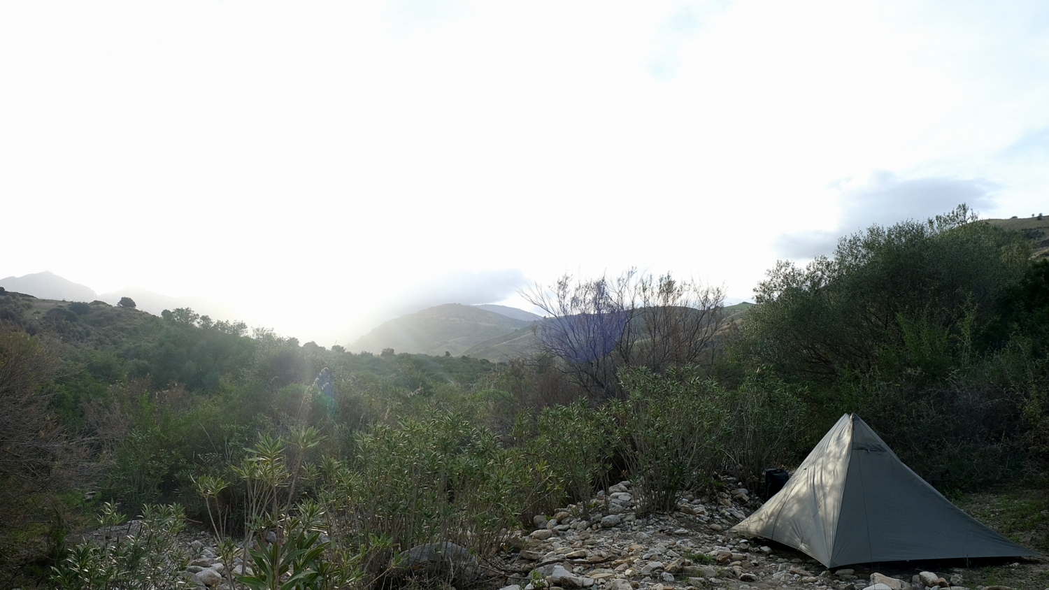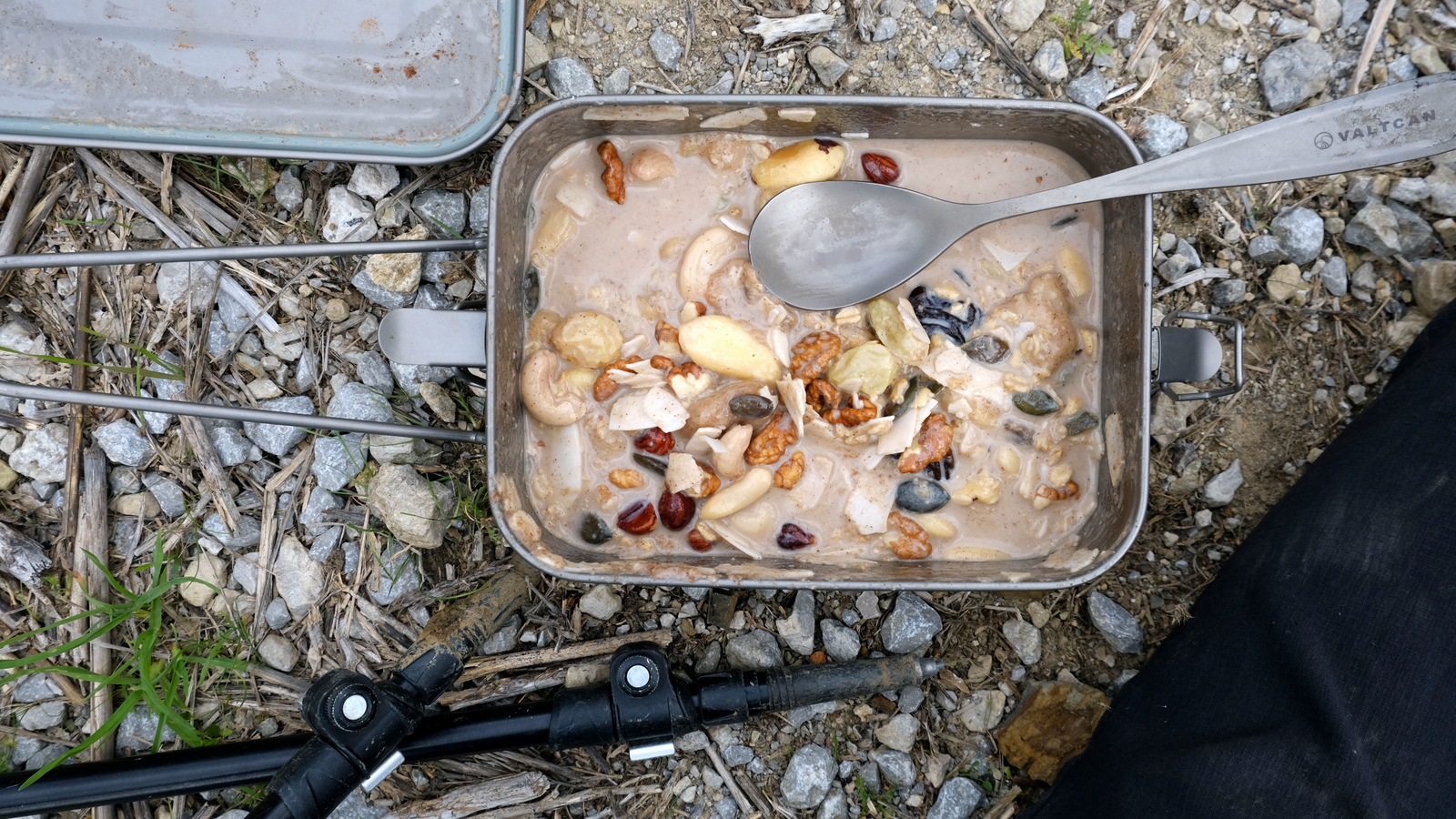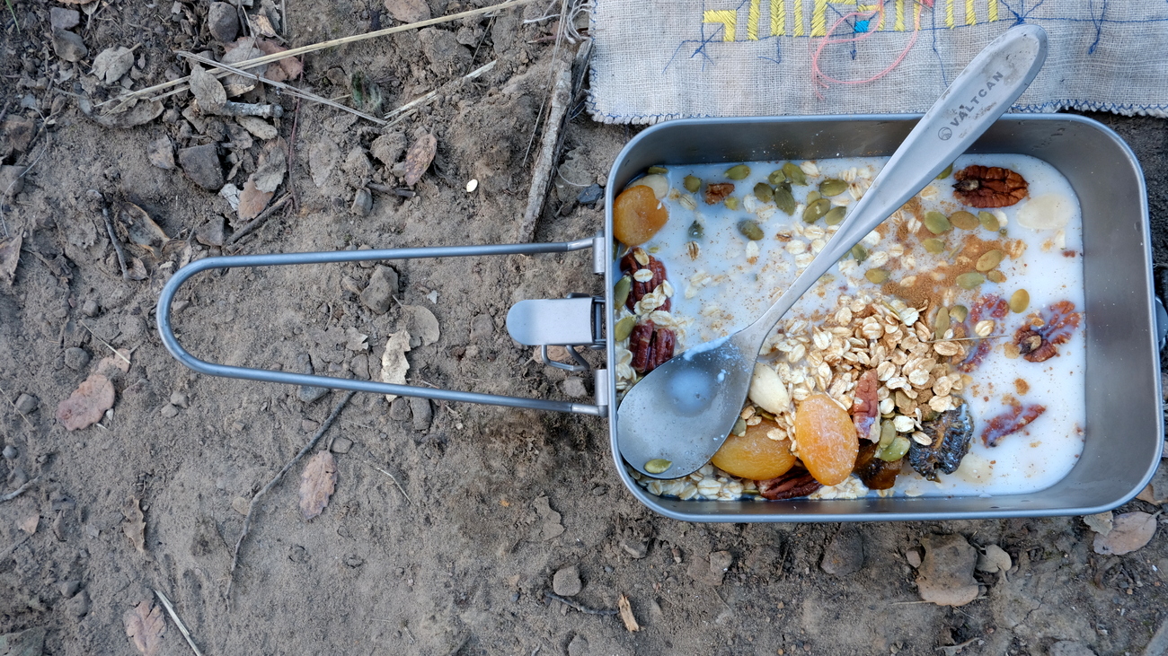Aware that wild boars can fetch my food supply at night, everything is safely secured under the thin fly of the tent. Near the mesh inner tent and the outside, a titanium bento-box stands soaking oats, seeds and nuts. Asleep in nighttime I hear sounds too sophisticated for a wild boar, upon which I scream to scare it off. When it doesn’t, my earplugs are removed and the headlamp switched on. A fox. A lovely orange creature trying to get a hold of the bento-box with oats. Never knew they fancied oats?