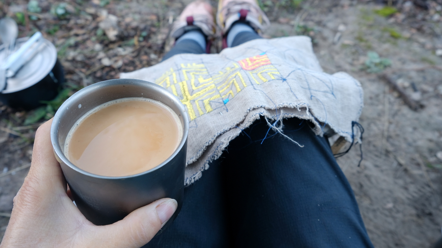 In my half sleeping state I start to wonder: ‘What if here are wolves? Would I be able to chase them off so easily as well?’ and ‘What if here are Abruzzese shepherd dogs? Or… or, a bear?!’ suddenly I realize how irresponsible it is to have so much food so near to me. Not only that, I start to fret about the spot I’d chosen: under a dead tree with many fallen branches on the ground. A bit later, I wake up by wild boars snorting at the creek behind me. Deciding to rise, I prepare several chai on a fire and the day looks good.