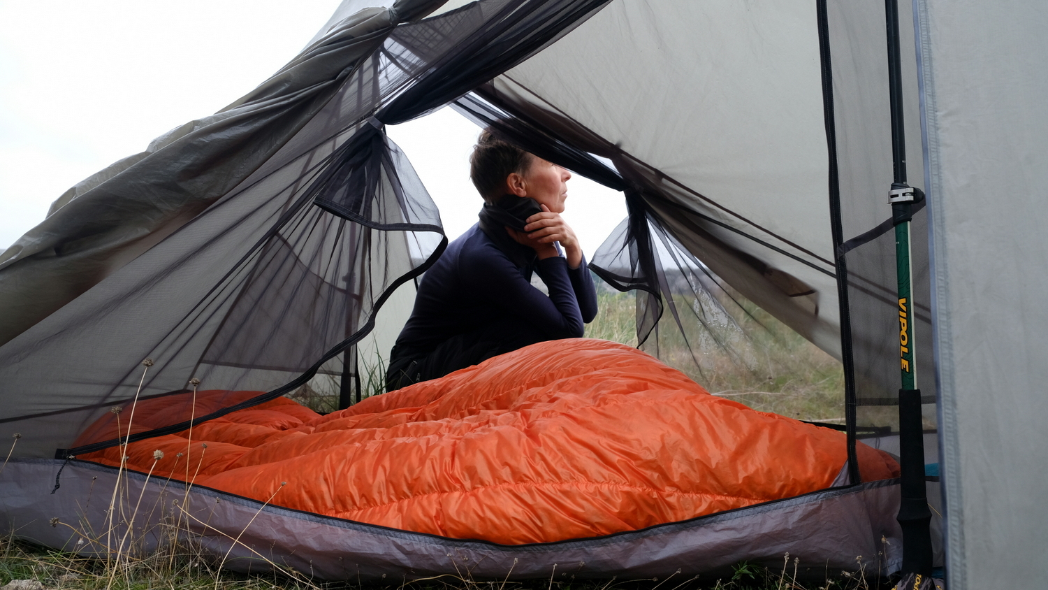 I bought this tent for € 372,60 online. An ultra light tent that weighs only 720 gram (25 oz). The poles are your walking sticks and both are needed to erect the tent.